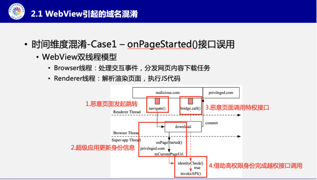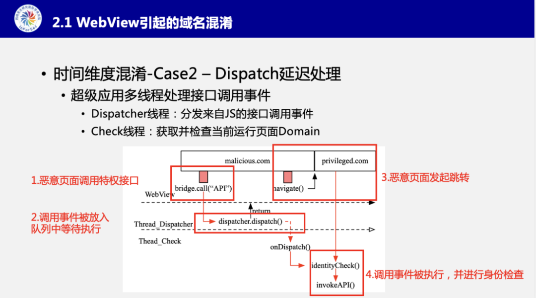 张博士针对时间维度的混淆展开了详细的举例论证,即WebView的多线程模型以及超级应用Dispatcher多线程处理的两种情况下,都会为身份识别带来时间维度上的精度缺失。