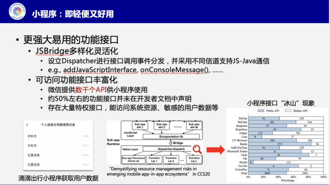 另一方面,小程序所能访问的移动端功能丰富且敏感。张博士通过一个前置研究指出,当前小程序提供的功能接口不仅包括了公开文档中的,还有很多是隐藏在接口调用事件分发器“Dispatcher”背后的,并且这些隐藏接口大部分都是特权接口,它们能提供十分敏感的功能,例如访问系统资源和用户数据等。