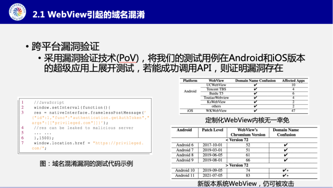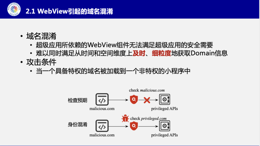 在本次演讲中,张智搏博士重点围绕基于域名的混淆漏洞来展开他们的研究介绍。张智搏博士介绍到,他们发现基于域名的混淆漏洞存在两种维度,一是时间维度上的混淆,二是网页框架(frame)维度上的混淆。前者说的是超级应用的线程与小程序运行WebView实例中的线程存在条件竞争导致。而后者是说用来获取域名身份的接口无法反应多重嵌套网页中的细粒度的网页框架的身份。