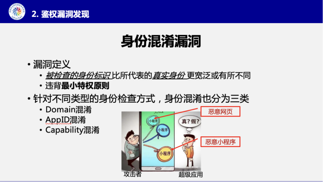 然后张博士介绍了他们研究中发现的身份混淆漏洞(Identity Confusion)定义,即在小程序生态中,一个被赋予特殊权限的身份往往要比它实际代表的对象更宽松,从而违背了最小特权原则。并划分出三类身份混淆漏洞:基于域名的混淆,基于小程序ID的混淆,以及基于能力的混淆。