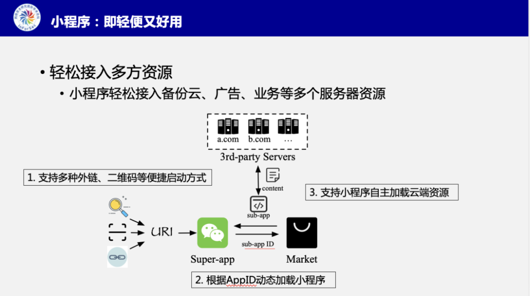张博详细分析到,在小程序生态中,存在十分多样的资源加载。具体来说,用户通过点击外链或者扫描二维码,就能从小程序应用市场中加载一个小程序,同时这个小程序也会从第三方服务器上额外加载许多网页资源。