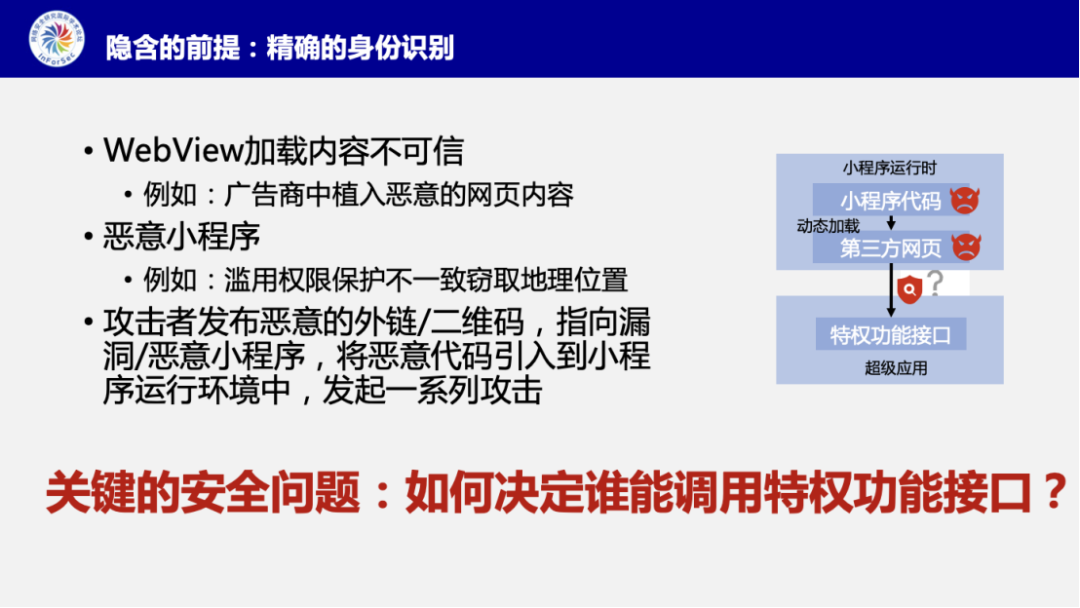 进一步,张博指出在保护这些敏感资源时的一个重要安全问题:超级应用如何决定谁能调用特权接口。这属于访问控制范畴中的身份检查设计问题。特别是面对WebView中可能加载的不可信的网页内容,以及流入到小程序应用市场的恶意小程序,保护特权接口不被滥用显得尤为重要。