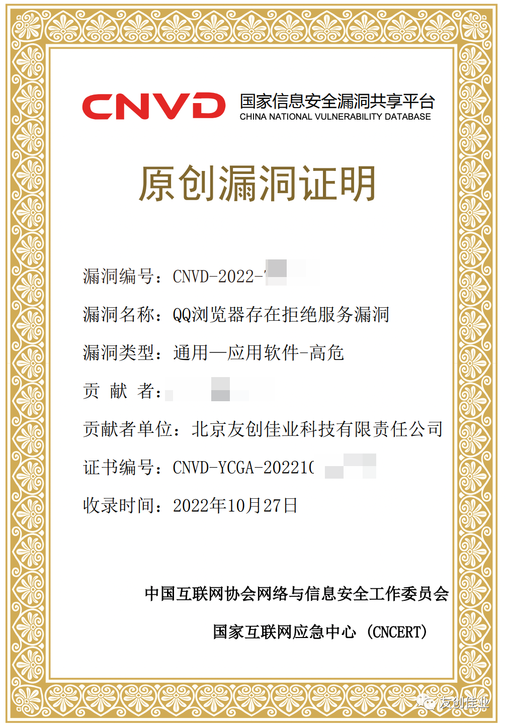 友创佳业安服团队发现QQ浏览器存在高危0day漏洞,本次漏洞预警不公布漏洞细节,以防被恶意利用,请用户保持版本更新,勿点击不明链接。