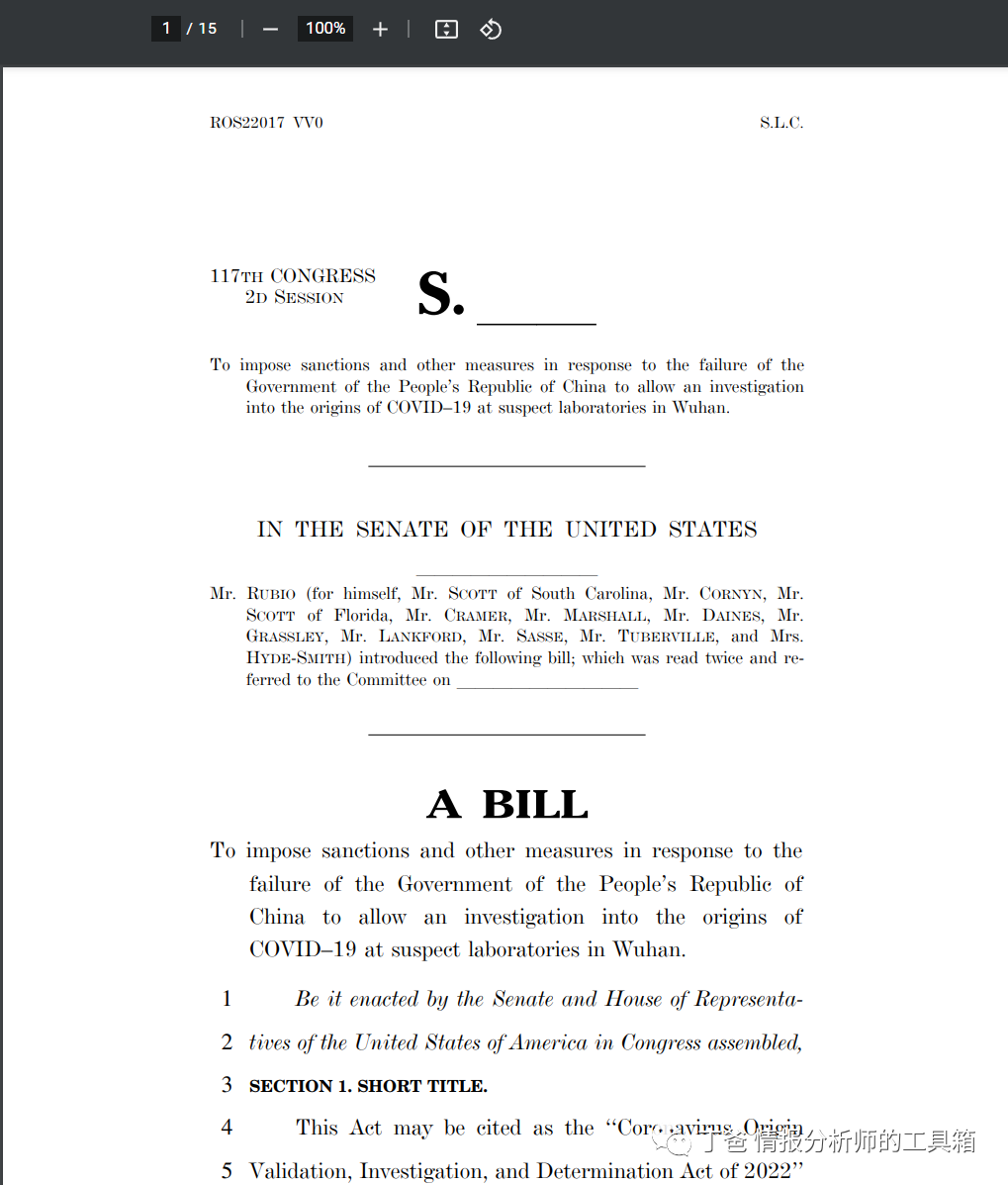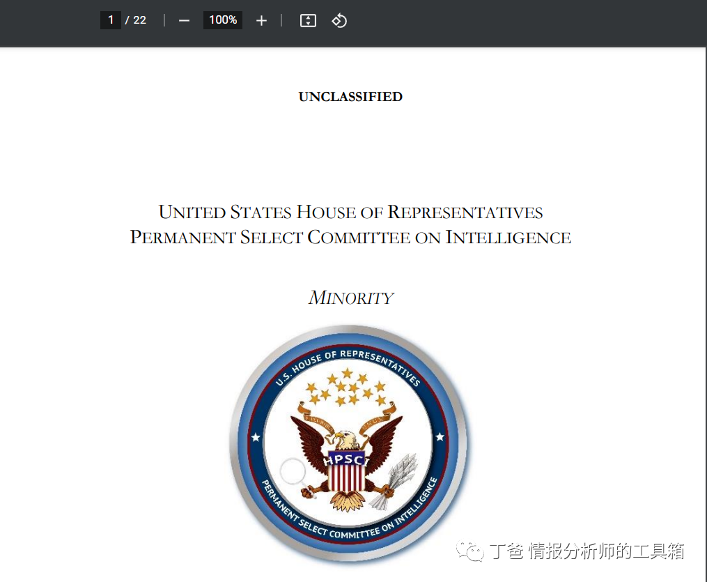 2、同时,情报委员会的共和党议员也发布了一篇与新冠溯源相关的22页报告。