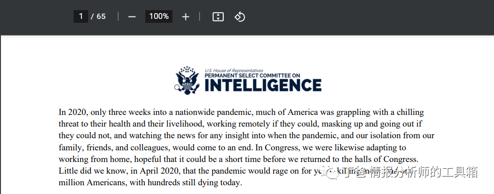 1、美国众议院情报委员会解密了主席亚当·希夫(Adam B. Schiff)(民主党)的一篇与新冠调查溯源相关的65页报告。
