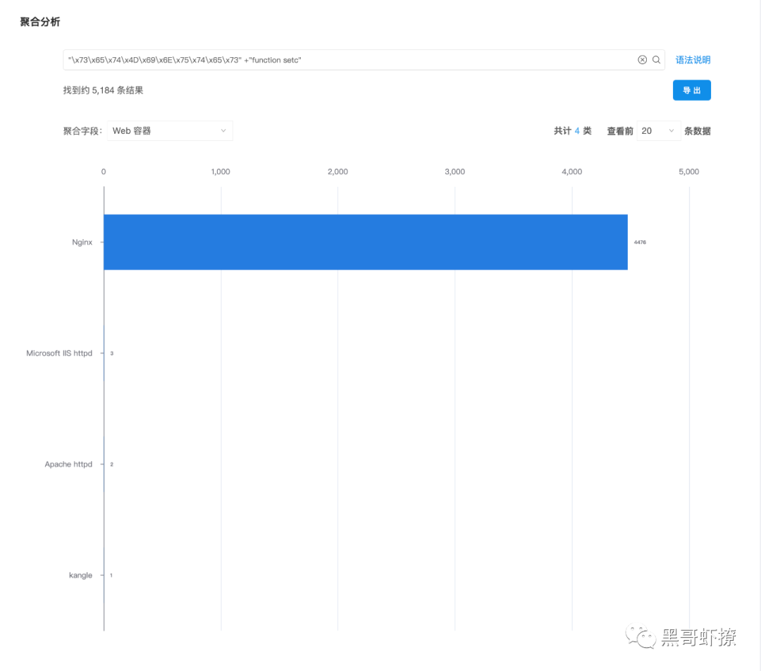 从侧栏来看大部分集中在网站域名,ipv4比较少。从国家分布来看主要是在美国,中国(其中中国基本是在中国香港),所以这个符合官方公告里的受影响在“境外服务器”的描叙。我们继续通过聚合查询能不能看到一些东西,从“Web容器”分布来看确实是在Nginx