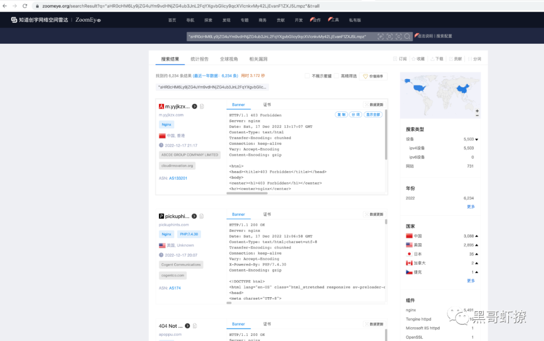 所以我们直接老套路果断的ZoomEye搜索:aHR0cHM6Ly9jZG4uYm9vdHNjZG4ub3JnL2FqYXgvbGlicy9qcXVlcnkvMy42LjEvanF1ZXJ5Lmpz 如下图: