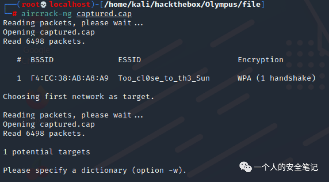 将它传递至本地用 aircrack-ng 读取验证一下,发现存在一个有效的无线网络信息。