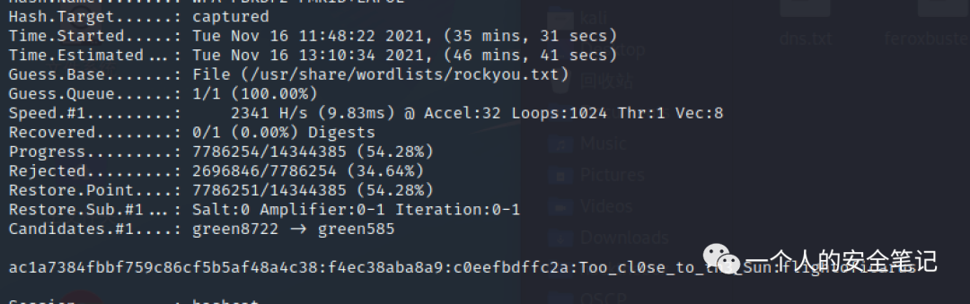 $ hashcat -a 0 -m 22000 captured --force /usr/share/wordlists/rockyou.txt等待一段时间后成功得到无线连接的明文密码:flightoficarus