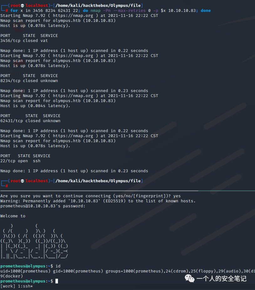 "prometheus, open a temporal portal to Hades (3456 8234 62431) and St34l_th3_F1re!"也是第一时间没看懂,去官方论坛中寻找解析后才知道这里用到了 Port Knocking 技术。