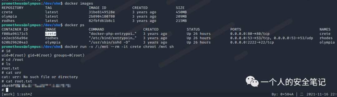 OK,已经成功处于容器外了,而且在 id 命令的结果中看到存在 docker 组权限。