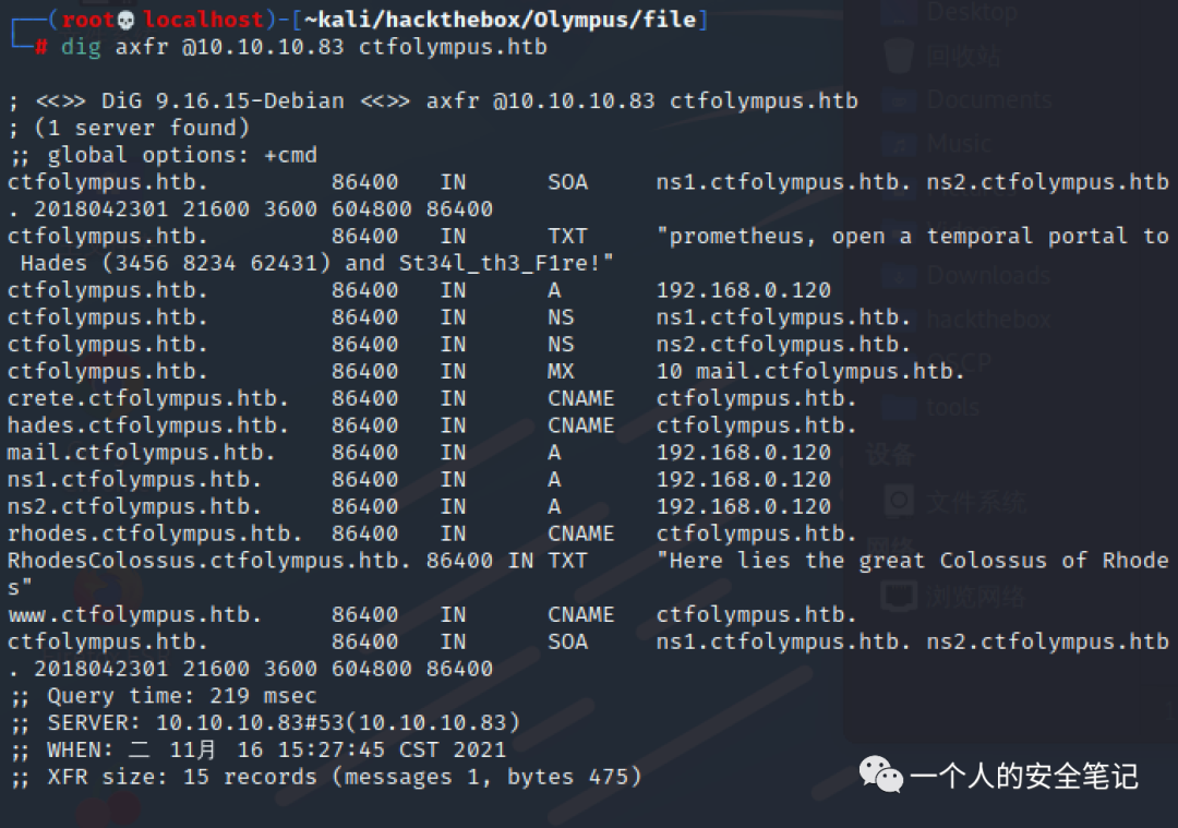 首先通过 dig 去验证下 ctfolympus.htb 域名是否存在,发现采用 axfr 记录查询返回了很多域名,这种也叫DNS区域传送漏洞(很早就知道这个,但在正式的生产环境中我一次都没遇到过)。