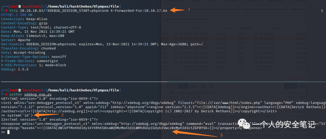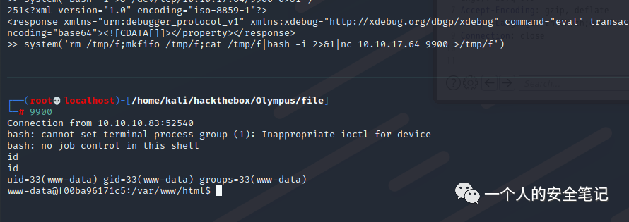 2. 在 Web 服务返回请求数据库中发现存在 Xdebug RCE 漏洞,并成功通过该漏洞进入了目标服务器所运行的 Docker 容器中。Xdebug 是一款常用的 PHP 调试工具,但是它也存在漏洞,攻击者可以利用这些漏洞进行远程代码执行 (RCE) 攻击。Docker 容器是一种用于管理应用程序的轻量级虚拟化技术,攻击者进入了 Docker 容器后就可以对应用程序进行更多的操作。