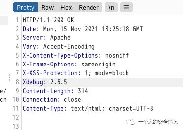 用浏览器访问目标服务的 80 端口,从返回的响应数据包中能够发现存在 Xdebug: 2.5.5 的 header 信息。