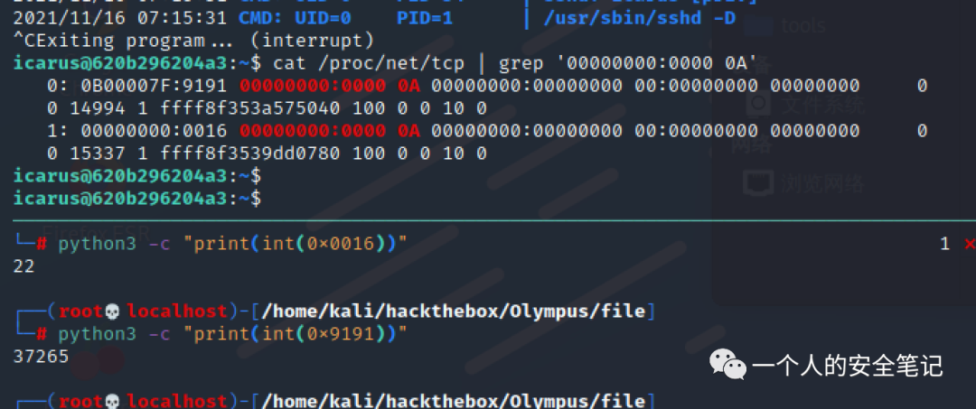 因为容器的体积很小所以一般是没有安装 ip、ifconfig 这类命令的,所以这里我参考 IPPSEC 以前视频中出现过的信息收集方式,通过查看 /proc/net/tcp 获取: