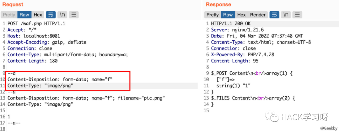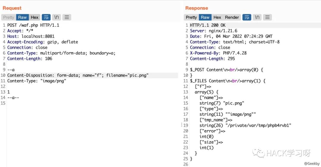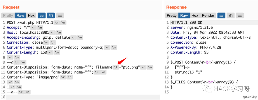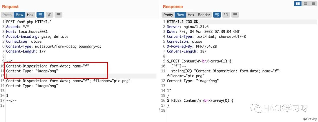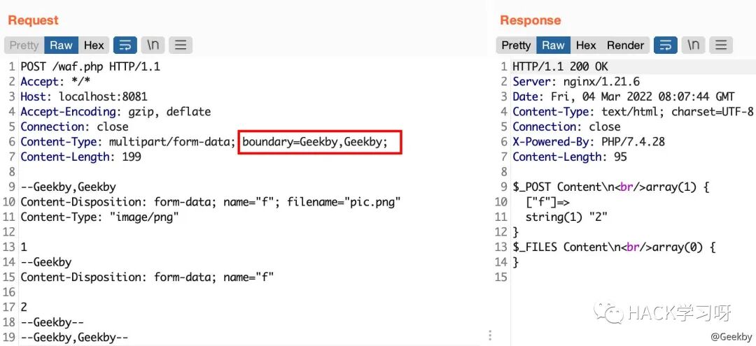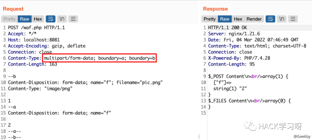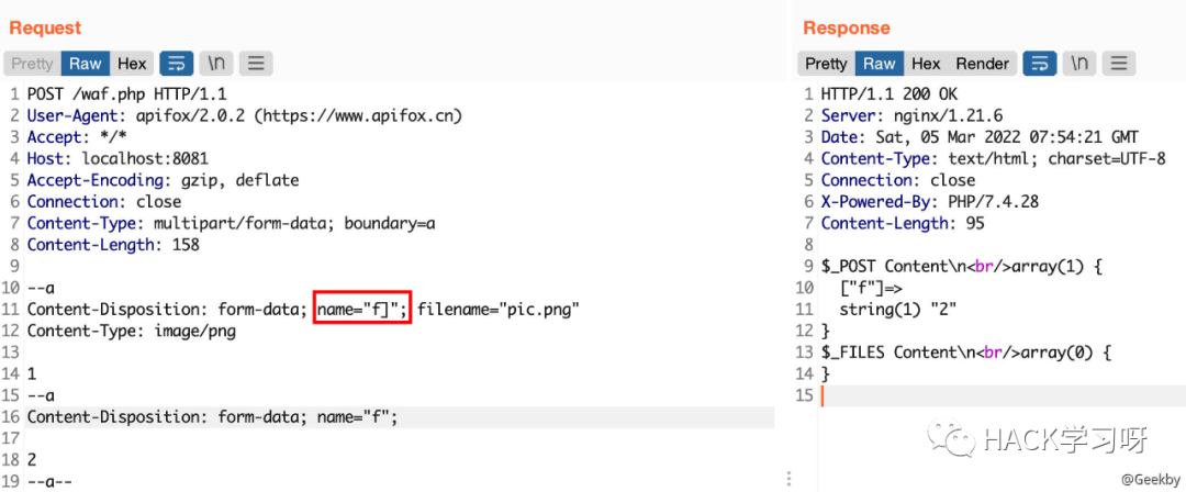 multipart/form-data 格式也是可以传递 POST 参数的。对于 Nginx + PHP 的架构,Nginx 实际上是不负责解析 multipart/form-data 的 body 部分的,而是交由 PHP 来解析,因此 WAF 所获取的内容就很有可能与后端的 PHP 发生不一致。
