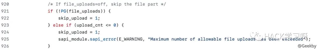 当文件上传数量超出最大值后,会跳过当前 part 文件的处理。在 php 5.2.12 和以上的版本,有一个隐藏的文件上传限制是在 php.ini 里没有的,就是这个 max_file_uploads 的设定,该默认值是 20, 在 php 5.2.17 的版本中该值已不再隐藏。文 件上传限制最大默认设为 20,所以一次上传最大就是 20 个文档,所以超出 20 个就会报错。