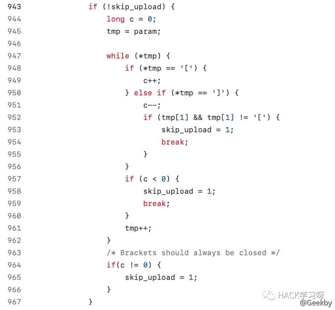 其中的 param 就是 name="f",当程序进入 c < 0 这个分支时,就会跳过当前 part 的上传流程。由于初始化时 c = 0,遇到 [ 时,c += 1,遇到 ] 时,c -= 1。因此,可以构造 name="f]",即可让 c = -1。