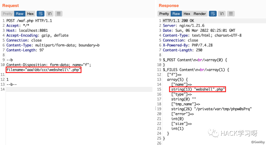 整体上的思路为:filename="file_name.php",对于 WAF 层面来说,发现扩展名为 php,接着进行拦截,绕过的目标为,使 WAF 解析出的 filename 不出现 php 关键字,并且后端程序在验证扩展名的时候会认为这是一个 php 文件。