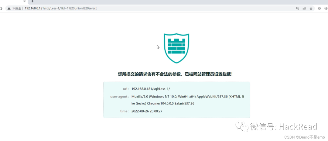 http://192.168.0.108/sql/less-1/?id=1' union select %23出云锁拦截页面,说明云锁布置成功,如下