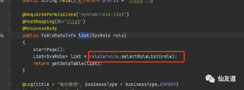 src/main/resources/mapper/system/SysRoleMapper.xml#58=> com.ruoyi.system.mapper.SysRoleMapper#selectRoleList=> com.ruoyi.system.service.impl.SysRoleServiceImpl#selectRoleList=> com.ruoyi.web.controller.system.SysRoleController#list=> com.ruoyi.system.domain.SysRole#dataScopeSysDeptMapper