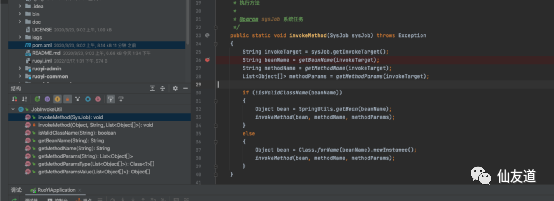 com.ruoyi.quartz.util.JobInvokeUtil#invokeMethod(com.ruoyi.quartz.domain.SysJob)com.ruoyi.quartz.util.QuartzDisallowConcurrentExecution#doExecute调用invokemethod方法,此处为JOB具体任务类com.ruoyi.quartz.controller.SysJobController#run3、调用目标字符串的参数为:支持字符串,布尔类型,长整型,浮点型,整型