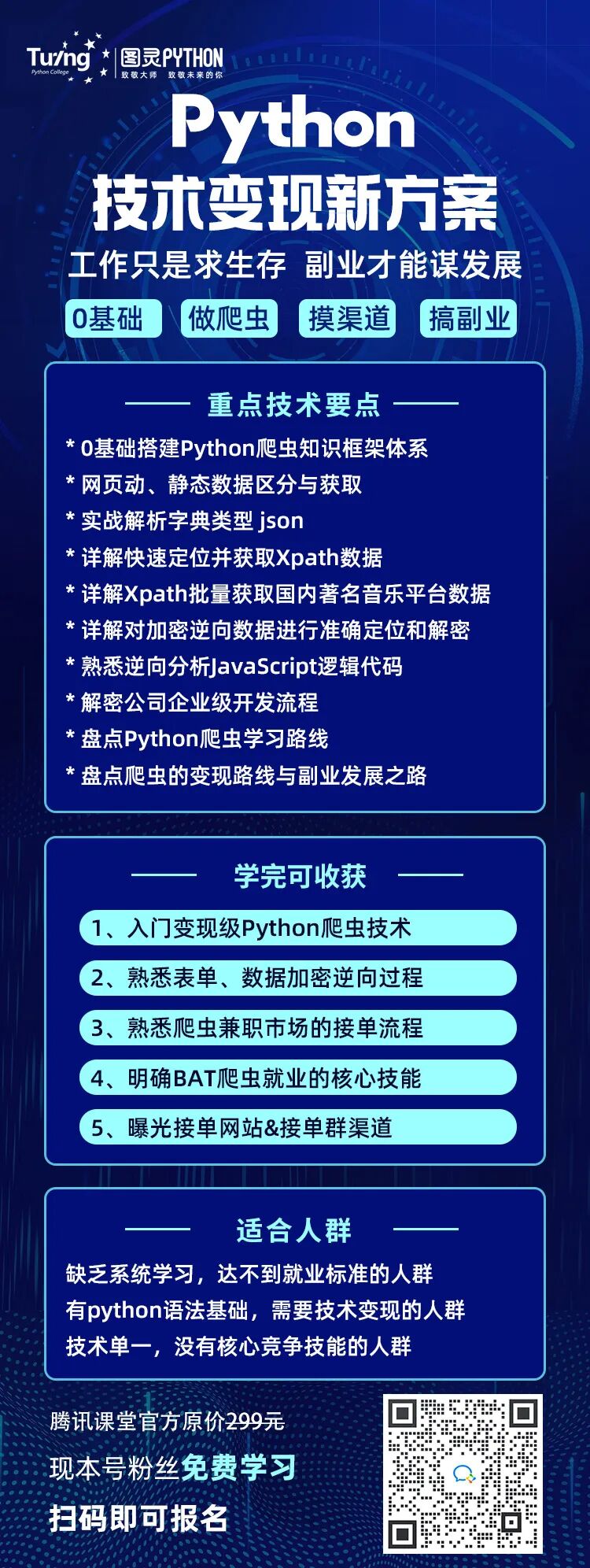 想要快速学好爬虫,尤其是可以用于变现的高阶爬虫技术,我推荐大家直接来腾讯课堂学习Python技术变现特训课。