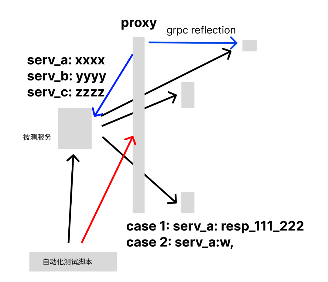 这个 proxy 可以和自动化测试脚本交互,由脚本来设定相应的服务、请求和响应匹配规则,可以做到 case by case 的请求响应匹配/隔离,也就是可以动态地对 serv_a,serv_b,serv_c 这样的服务做 mock。