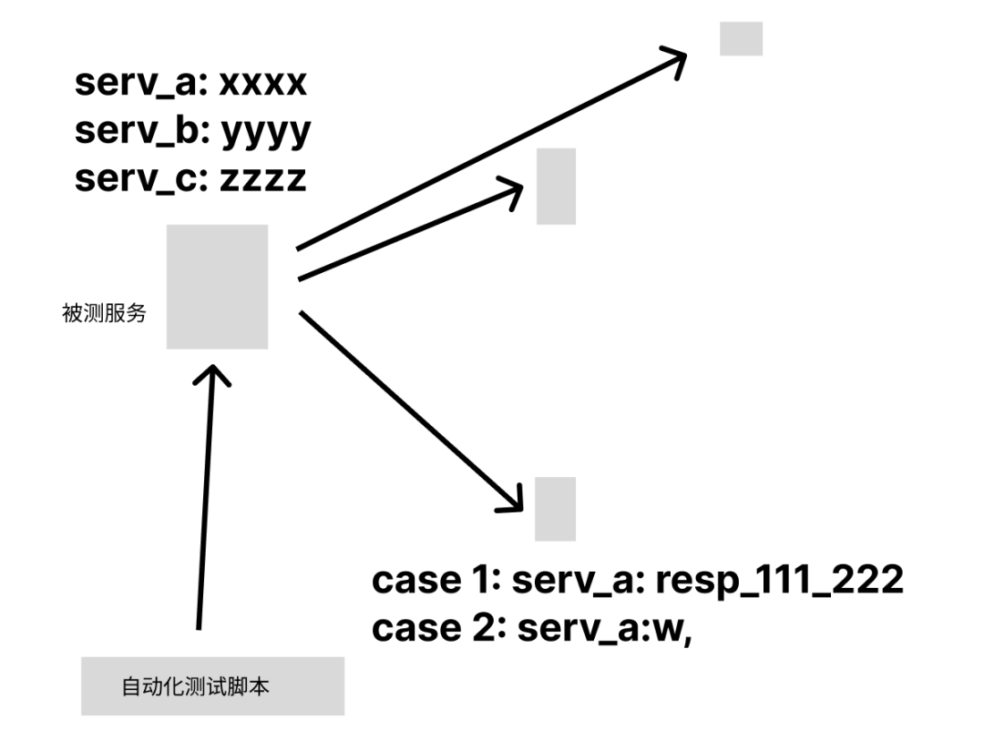 如上图,自动化测试脚本对被测服务发起测试,希望看被测服务是否能够处理各种外部依赖的正常/异常流程,这时候希望能够在不侵入被测代码的前提下,能够改变被测服务依赖的外部服务(即这里的 serv_a,serv_b,serv_c)的返回结果,在 java 中有 jvm-sandbox 这种能够比较方便地对测试进行隔离,并且动态修改 class 实现的神器,但是在 Go 里,这个需求不太好实现。