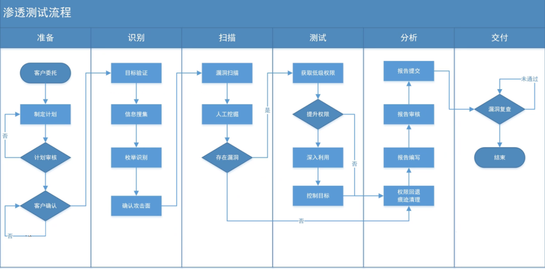 下图,为我在学习课程之前了解到的渗透测试流程: