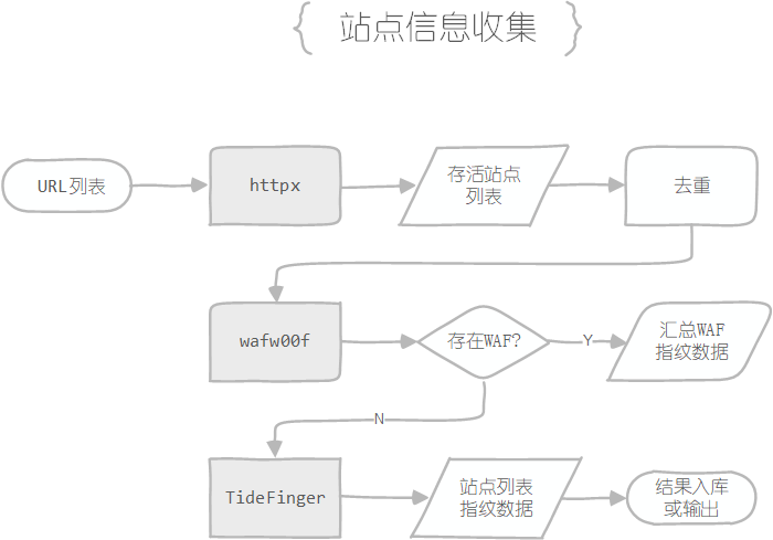 URL数据 → 站点验活 → 站点去重 → 站点指纹识别 + WAF检测 → 目标站点列表