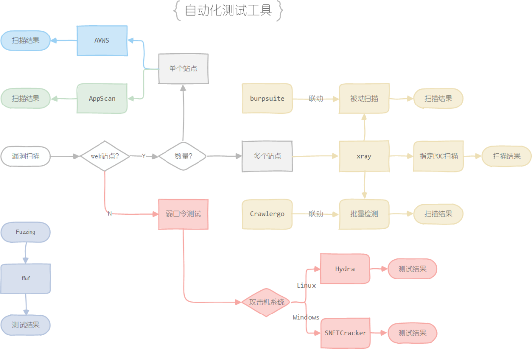其中弱口令枚举工具是对一些非WEB端口可能存在弱口令的应用进行测试;而漏扫工具和Fuzzing工具则是针对WEB服务进行测试