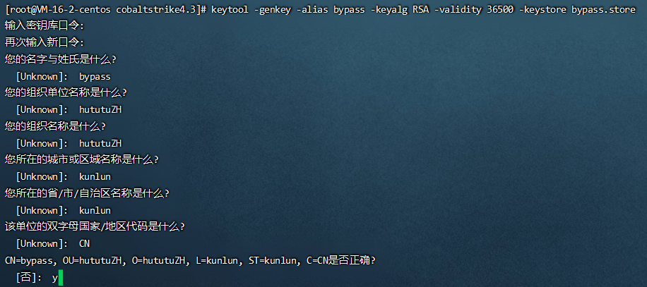 keytool -genkey -alias bypass -keyalg RSA -validity 36500 -keystore bypass.store自己设置相关密码,根据提示设置相关信息即可生成新的文件。