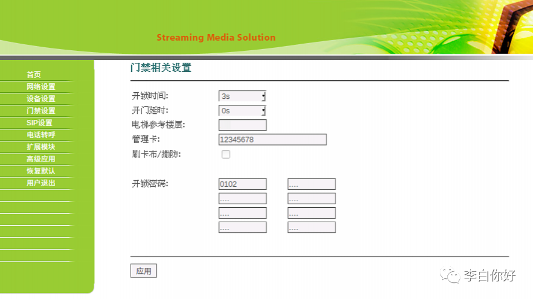 mini_httpd/1.19 19dec2003这一类机器是所有的门禁机,包含了住户家里的对讲机,楼栋大堂的门禁机,车库电梯的门禁机,小区大门的门禁机,通过ip地址以及admin / 123456弱口令可以远程控制,同时telnet也可以连接,管理页面功能很全,包括修改密码,控制开门时间,控制门禁机密码,呼叫住户,呼叫物业中心,恢复出厂设置等等,功能丰富,界面如下