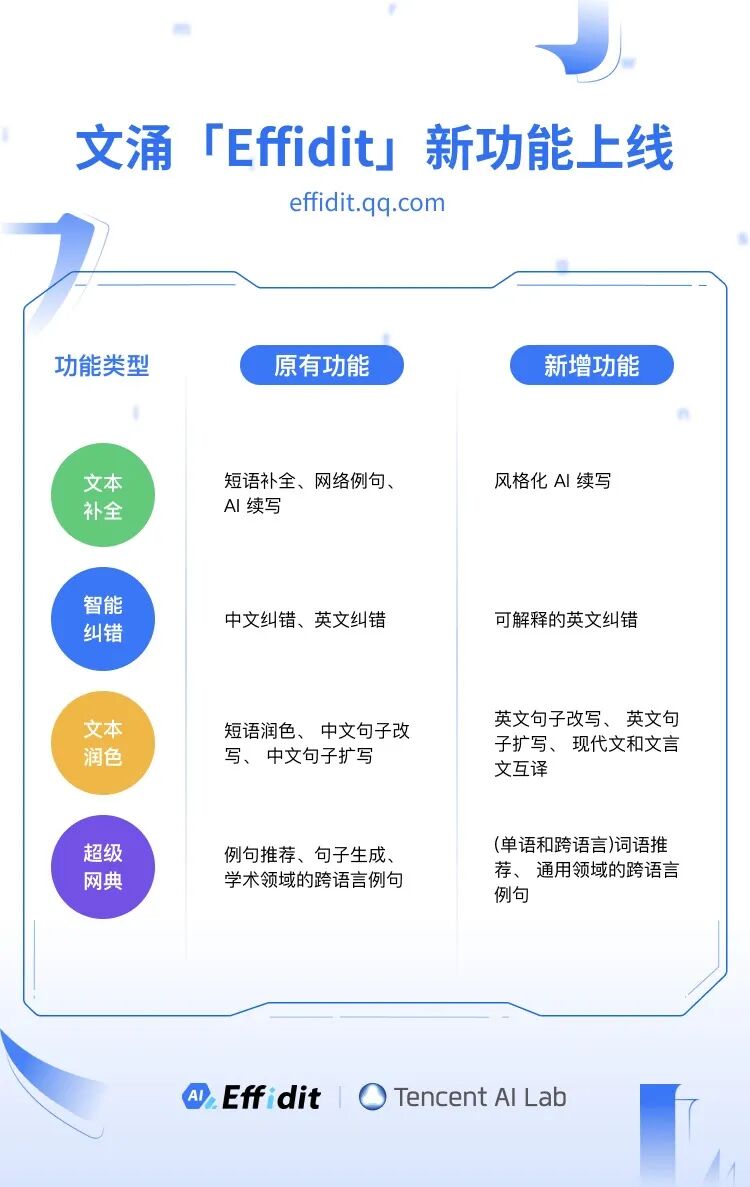近日,腾讯 AI Lab 将智能创作助手文涌(Effidit)更新到了2.0版本(effidit.qq.com),帮助写作者更好地应对上述难题。新版本除了优化第一版[1,2]已有的功能之外,还带来了风格化文本续写、英文句子改写与扩写、现代文和文言文互译、词语推荐、跨语言例句推荐(中英)、可解释的英文纠错等新功能。