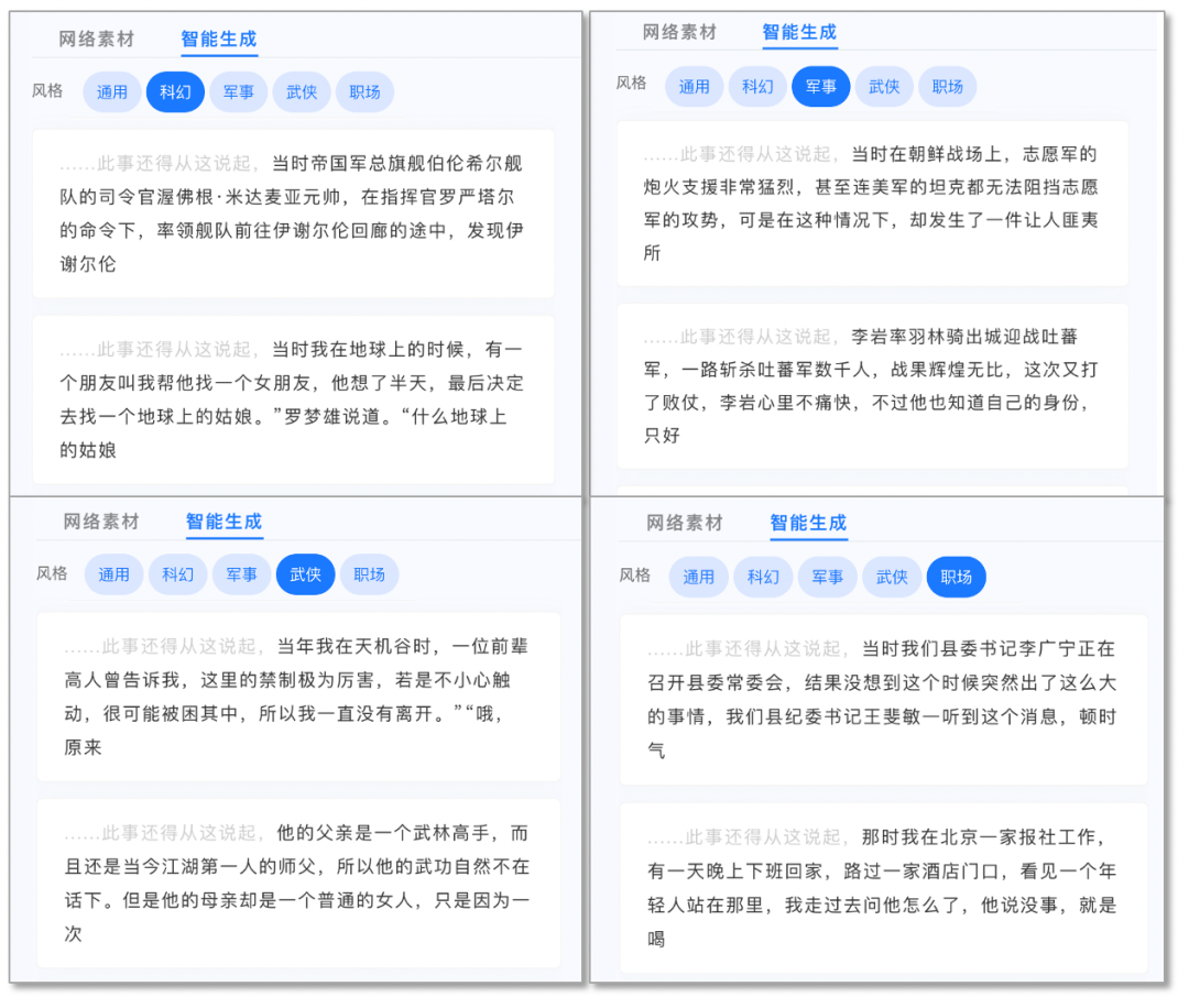 如下图所示,对于每种风格,文涌会提供多个续写候选给用户进行选择,启发用户创作思路。