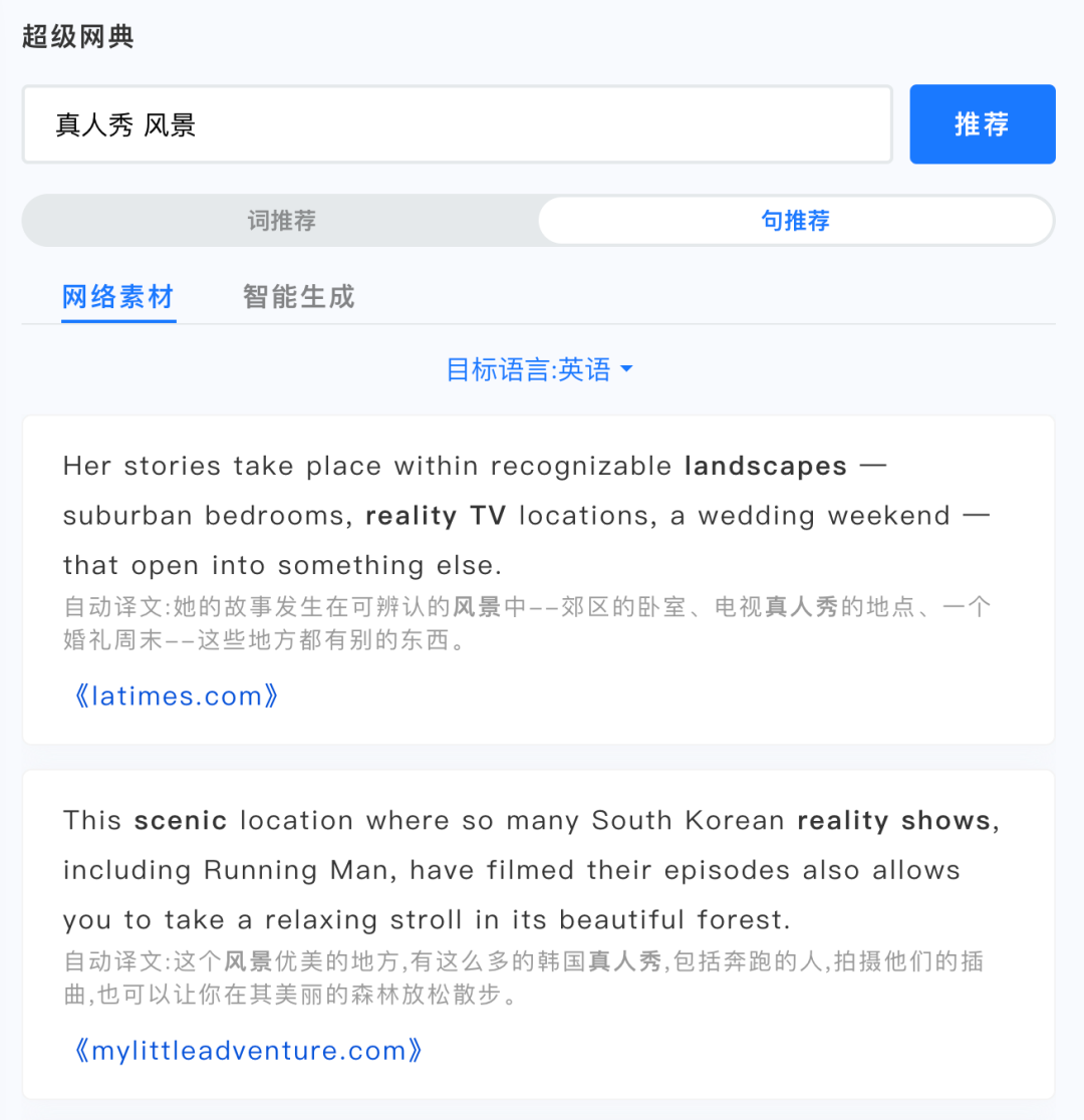 「跨语言例句推荐」可以根据输入的一个或者多个中文关键词推荐英文例句,帮用户了解对应的英文地道表达,并提供中英对照帮助更好的理解英文语义,助力写出高质量的英文文章。