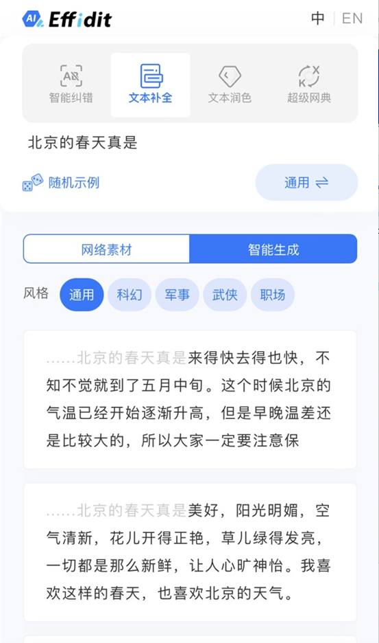 在保留 1.0 版「短语补全」、检索式「句子补全」和生成式「自动续写」三大功能的同时,文涌 2.0 版推出了中文风格化续写服务。用户可以从通用、科幻、军事、武侠、职场等五种文风中选择一种进行续写。