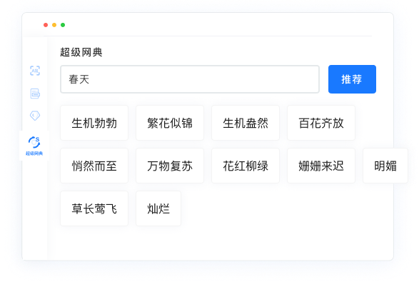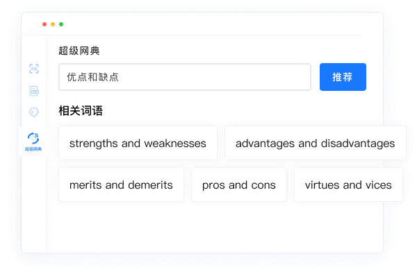 词语推荐功能包含「单语词典」和「双语词典」。「单语词典」为用户提供与所输入的关键词相关的其它词语,例如同类词、相关的修饰词或描述、相关人物、地点、机构等;而「双语词典」则显示词语之间的跨语言关联(根据中文关键词推荐英文词语,或根据英文关键词推荐中文词语)。词语推荐功能的定位是帮助用户高效地寻找最合适的词语来表达心中的想法,提升文本质量,提高写作效率。