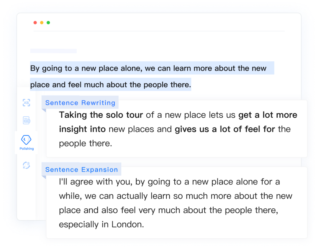 英文「句子改写」通过 AI 生成技术,产生多个高质量、流利地道的英文改写结果为用户带来表述新思路。英文「句子扩写」在保留原句的基础上,将句子扩写为更具体、生动、形象的表达。
