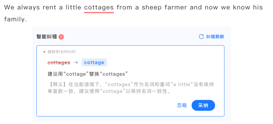 文涌 2.0 版在提示纠错修改的同时,额外显示了纠错的原因,帮你更自信的进行英文文章修改。