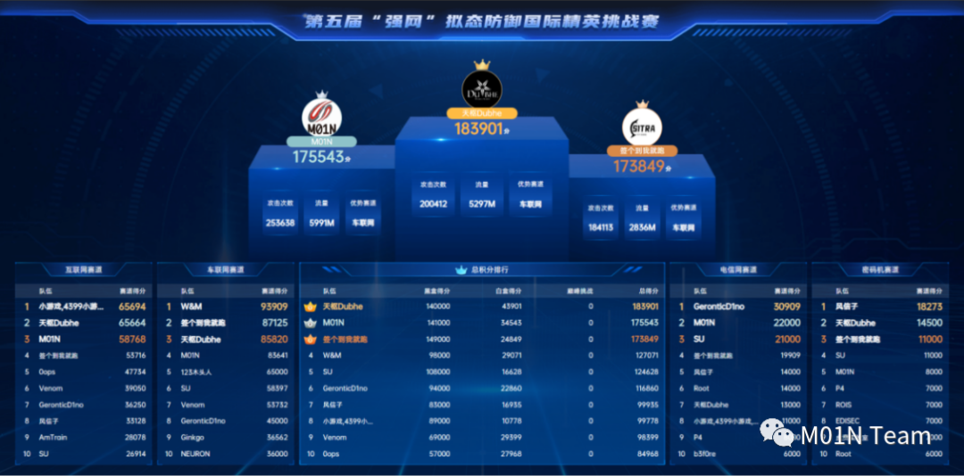 12月15日至18日,第五届“强网”拟态防御国际精英挑战赛正式开赛。来自国内外60支顶尖战队通过云上和线下相结合的方式展开了72小时的高强度对抗。绿盟科技M01N战队作为特邀战队,凭借出色的团队协作和深厚的基础功底,在60支参赛队伍中脱颖而出,斩获大赛一等奖,同时荣获电信网赛道二等奖、互联网赛道三等奖的好成绩。